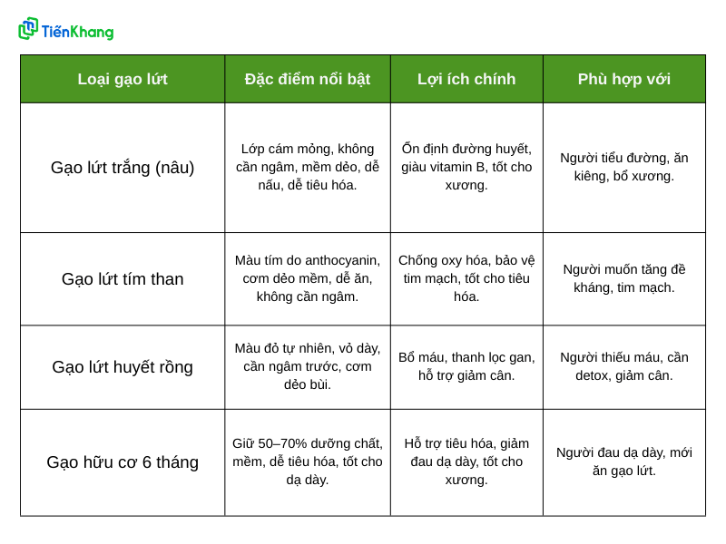 Để giúp bạn dễ dàng lựa chọn loại gạo phù hợp với nhu cầu và thể trạng, Tiến Khang đã tổng hợp bảng so sánh một số loại gạo lứt dễ ăn nhất hiện nay, kèm theo đặc điểm nổi bật, lợi ích chính và đối tượng sử dụng phù hợp. Bạn có thể tham khảo bảng dưới đây để đưa ra quyết định chính xác hơn: