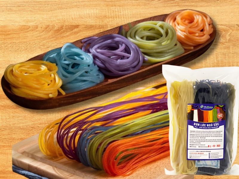 Bún gạo lứt ngũ sắc là một trong những loại bún được ưa chuộng nhất do đa dạng màu sắc, kích thích thị giác và vị giác giúp chúng ta ăn ngon miệng hơn.  Bún được làm hoàn toàn từ tinh bột gạo lứt kết hợp 5 màu vàng, tím, cam, xanh biển, xanh lá tương ứng với 5 màu tự nhiên của hạt dành dành, lá cẩm, hạt gấc, hoa đậu biếc và cuối cùng là rau chùm ngây. Khi nấu, sợi bún có vị ngọt nhẹ tự nhiên đến từ vị ngọt của gạo lứt, kết cấu của sợi bún mềm dẻo ngon.