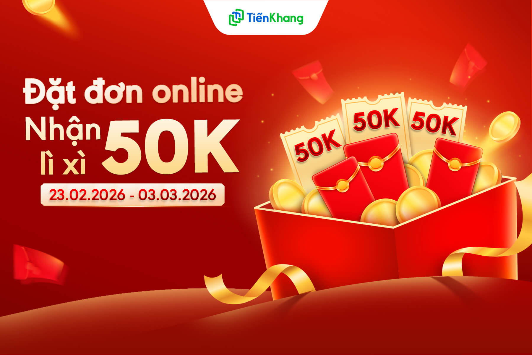 Với Quý khách ở xa hoặc ưu tiên mua sắm online, Tiến Khang triển khai song song chương trình Lì xì đầu năm cho đơn hàng trực tuyến.- Thời gian áp dụng: Từ ngày 23/02/2026 đến 03/03/2026 (Mồng 7 đến 15 âm lịch)