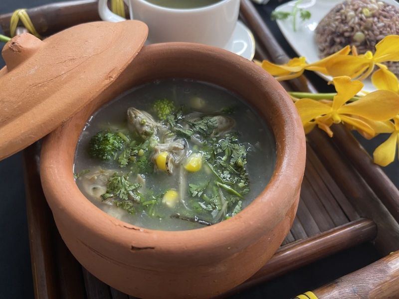 Cho phần bột sắn dây đã pha cùng với nước lọc vào để tạo độ sánh cho món súp.