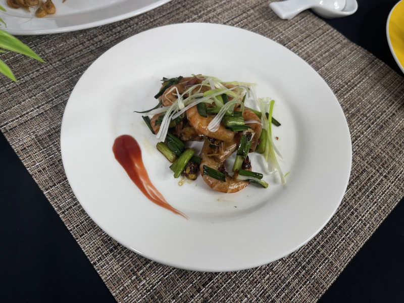 Khi tôm đã săn lại và ngấm gia vị thì rắc thêm 1 chút hành vào để món tôm rim thơm ngon hấp dẫn hơn.